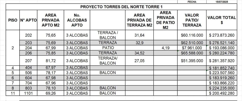 Los apartamentos del proyecto multifamiliar TORRES DEL NORTE se entregaran con: pisos de cocina, zona de ropas, y baños enchapados en cerámica. Pisos sala comedor, hall y alcobas en madera laminada. Pisos de terraza, patio y balcón cuando aplique, enchapados en tablón o tableta. Paredes internas de apartamento empastadas y pintadas. Ventanería en aluminio sistema corredera tipo vis con vidrio 4mm traslucido. Cocina semi integral (mesón inferior con estufa cuatro (4) puestos a gas, lavaplatos y gabinetes inferiores). Puertas internas de alcobas y baños en madera con chapa. Puerta principal metálica con chapa. Puerta ventana de acceso a terraza y balcón (cuando aplique) en aluminio y vidrio. Puerta de acceso a patio (cuando aplique) en aluminio. Divisiones internas en madera en área de closet. Citófono. Lavadero. Baños pañetados, estucados y pintados. Foso de la ducha enchapado a altura parcial. Combo sanitario tipo VIS en cada baño (sanitario, lavamanos, y tres accesorios). Ducha con grifería en cada baño. Barandas metálicas de balcón (cuando aplique) con anticorrosivo y pintura. Red interna de gas natural para 2 puntos (calentador y estufa). Red de agua caliente para duchas. Red interna de acueducto, alcantarillado y energía eléctrica. Medidor y pago de matrícula de acueducto y energía eléctrica. Red externa de gas natural con cajas para centros de medición. El costo de medidor y matricula de gas natural es por cuenta del comprad